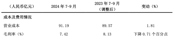 但运输成本作为最大开支在Q3出现较大幅度的增长,为43.56亿元,同比增长12.3%,主要是高运费低人工的整车、供应链等业务体量提升所致,该项支出直接拉高了公司的营业成本。
