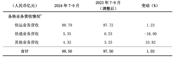 这一调整使得德邦股份的营收结构发生变化,快运业务在总营收中的占比显著提升。证券之星注意到,公司快运业务的表现在Q3并不算亮眼,实现营收为88.79亿元,同比微增1.23%,占营收的比重高达9成;快递业务实现营业收入为5.35亿元,同比减少18%;其他业务营业收入为4.35亿元,同比增长33.82%。