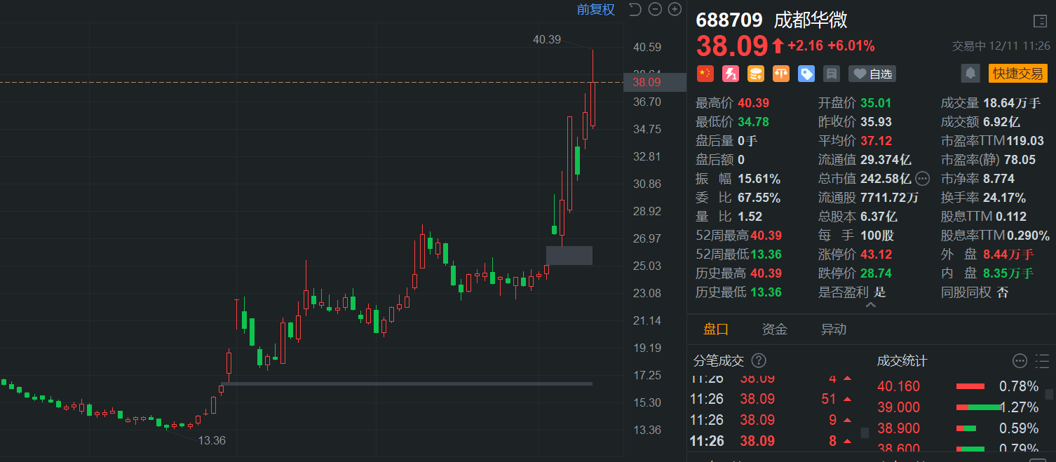 成都华微(688709.SH)盘中拉升涨超12%,报40.39元创上市新高价,月内累计涨幅高达60%,总市值245亿元。消息上,公司研发的8位64G超高速AD转换器HWD08B64GA1型成功发布。作为国内首款采用先进的28纳米工艺设计的8位64G超高速AD转换器,HWD08B64GA1不仅拥有卓越的抗辐照性能,而且实现了从设计到生产的全程自主可控,为国产高端芯片领域树立了新的里程碑。其性能更是达到了国际顶尖水平,展现了强大的竞争力。(格隆汇)