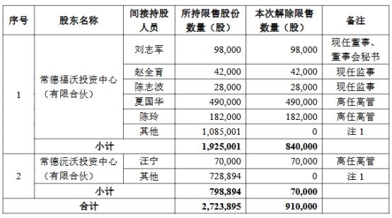 本次解除限售的股东户数共计2户,解除限售的股份数量为910,000股,占公司总股本的1.2107%,限售期原为自公司首次公开发行股票上市之日起12个月,鉴于公司股票上市后6个月内连续20个交易日的收盘价均低于发行价72.50元/股,触发延长股份锁定期承诺的履行条件,故本次申请解除限售的股东限售期为自公司股票上市之日起18个月。