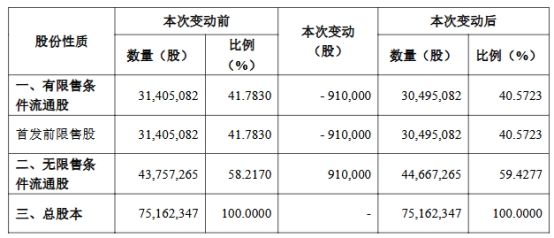 截至公告日,公司总股本为75,162,347股,其中无限售条件流通股票数量为43,757,265股,占总股本的比例为58.2170%;有限售条件流通股票数量为31,405,082股,占总股本的比例为41.7830%。