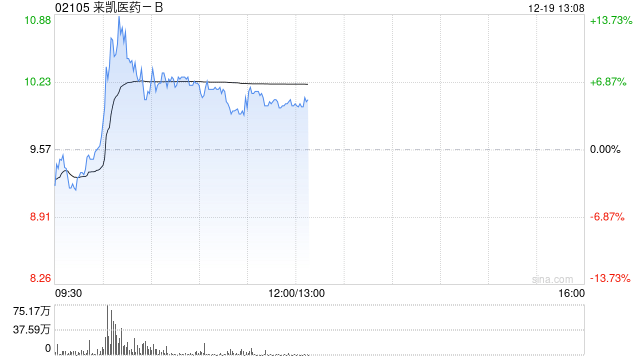 来凯医药-B(02105)盘中涨超13%,截至发稿,股价上涨5.12%,现报10.06港元,成交额1.115亿港元。