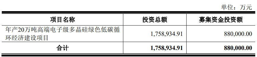 新特能源原拟在上交所主板发行不超过30,000万股(行使超额配售选择权之前,本次发行全部为新股发行,不存在原股东公开发售股份的情形),公司拟募集资金880,000.00万元,用于年产20万吨高端电子级多晶硅绿色低碳循环经济建设项目。
