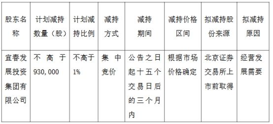 股东宜春发展投资集团有限公司计划在公告之日起十五个交易日后的三个月内,通过集中竞价交易方式减持不超过930,000股,不超过总股本的1%。