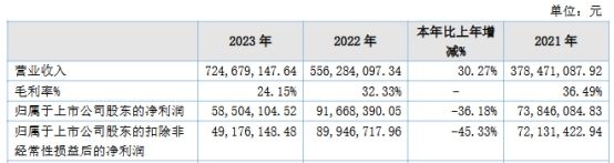 2022年、2023年,宁新新材营业收入分别为5.56亿元、7.25亿元,归属母公司股东的净利润分别为9,166.84万元、5,850.41万元,扣除非经常性损益后的归属母公司股东净利润分别为8,994.67万元、4,917.61万元。