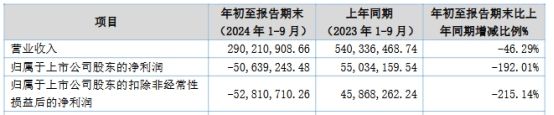 今年前三季度,公司营业收入2.90亿元,同比下降46.29%;归属于上市公司股东的净利润-5063.92万元,同比下降192.01%;归属于上市公司股东的扣除非经常性损益后的净利润-5281.07万元,同比下降215.14%。