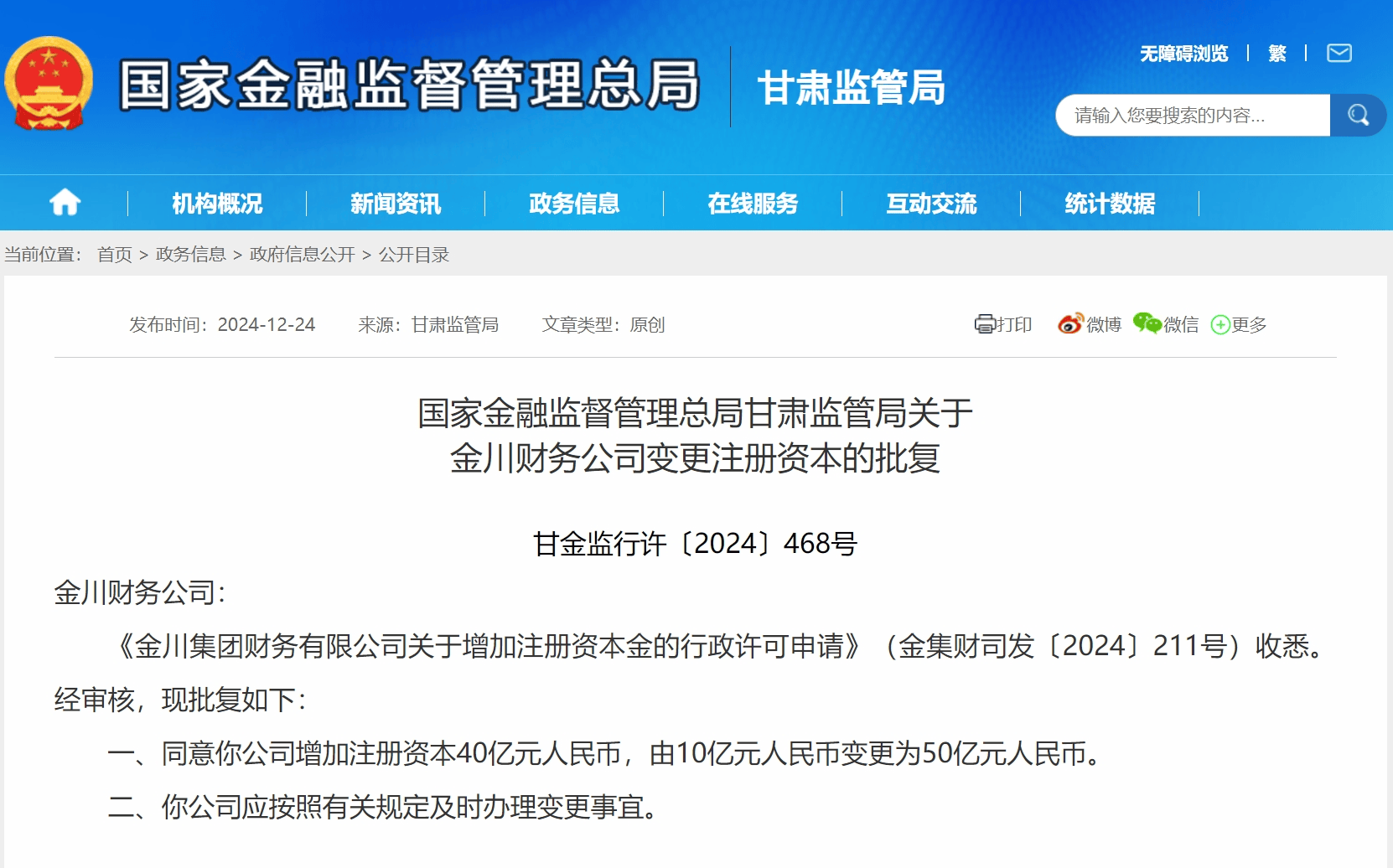 中国网财经12月25日讯 昨日,国家金融监督管理总局甘肃监管局发布相关批复,同意金川集团财务有限公司(简称:金川财务公司)增加注册资本40亿元人民币,由10亿元人民币变更为50亿元人民币。以下是相关批复正文: