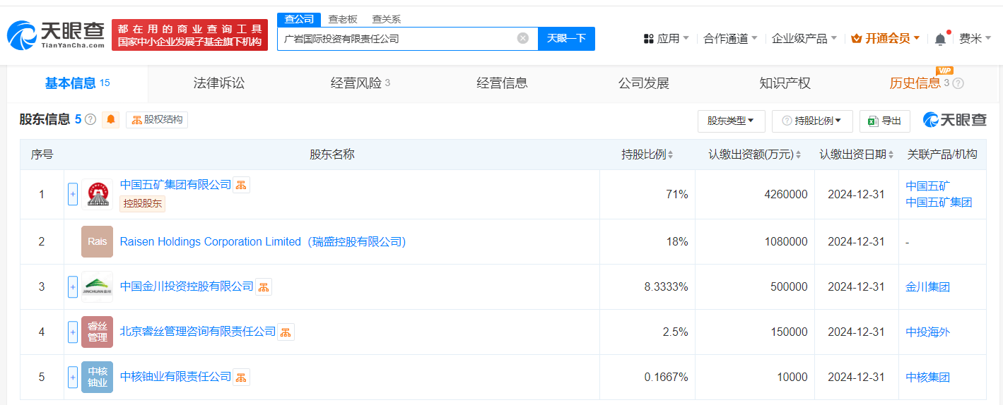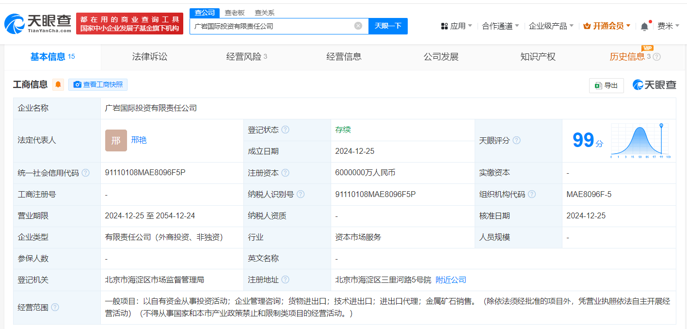 每经AI快讯,天眼查App显示,近日,广岩国际投资有限责任公司成立,法定代表人为邢艳,注册资本600亿元人民币,经营范围为以自有资金从事投资活动、企业管理咨询、货物进出口、技术进出口、进出口代理、金属矿石销售,由中国五矿集团有限公司、中国金川投资控股有限公司、中核铀业有限责任公司等共同持股。