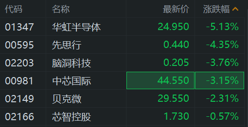 港股半导体股多数下跌,其中,华虹半导体绩后跌超5%,先思行跌超4%,龙头中芯国际跌2.3%,上海复旦、宏光半导体小幅上涨。