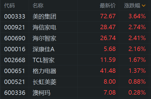 A股家电股逆势上涨,其中,美的集团涨3.6%,海信家电涨近3%,海尔智家、深康佳A涨超2%,TCL智家、格力电器、长虹美菱、澳柯玛跟涨。