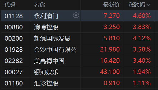 港股濠赌股盘初拉升,其中,永利澳门涨4.6%,新濠国际发展涨超4%,澳博控股、金沙中国涨约4%,美高梅中国涨3.4%,银河娱乐涨2%。