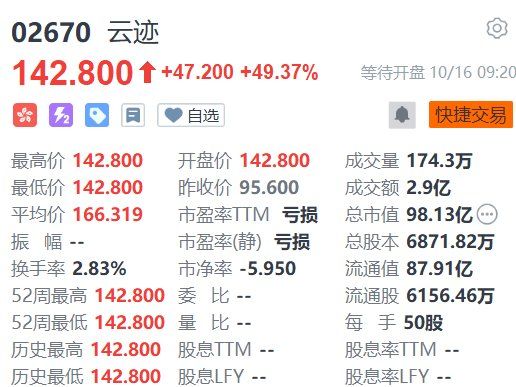 云迹(2670.HK)今日首日在港上市,高开49.37%,报142.8港元,最新市值98亿港元。云迹此次IPO定价95.60港元,公开发售获5657.20倍认购,国际配售获18.62倍认购。