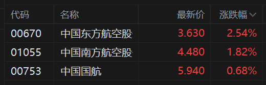 港股三大航空股继续上涨行情,其中,中国东方航空涨2.5%,3日连涨超15%,中国南方航空涨近2%,中国国航涨约1%。