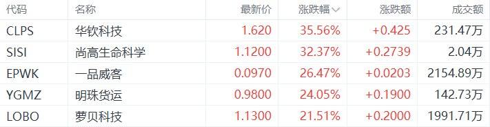 中概股收盘涨幅前五的个股为:华钦科技涨44.06%,尚高生命科学涨38.63%,一品威客涨23.82%,明珠货运涨21.38%,萝贝科技涨21.23%。(格隆汇)