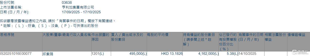 格隆汇10月17日丨根据联交所最新权益披露资料显示,2025年10月14日,亨利加集团(03638.HK)遭股东邱素娟在场内以每股均价13.1826港元减持49.5万股,涉资约652.54万港元。