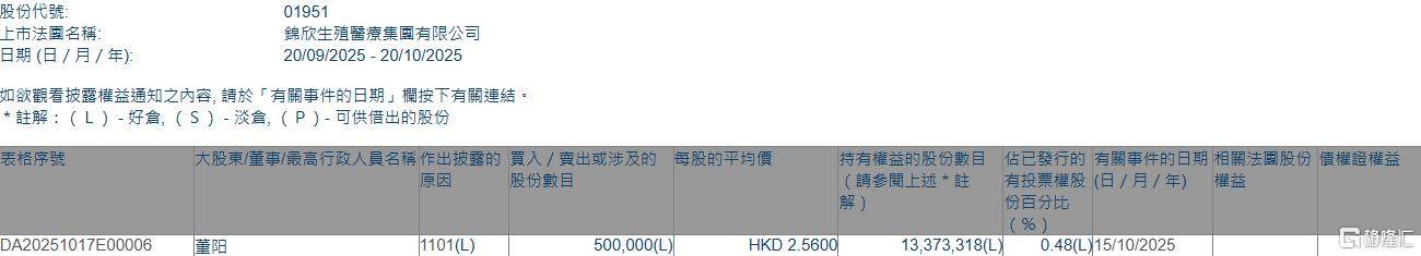 格隆汇10月20日丨根据联交所最新权益披露资料显示,2025年10月15日,锦欣生殖(01951.HK)获执行董事董阳在场内以每股均价2.56港元增持50万股,涉资约128万港元。
