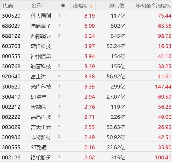 A股市场量子科技概念股继续集体走强,其中,科大国创涨超8%,国盾量子涨6%,西部超导涨超5%,富士达、盛洋科技、神州信息、迪普科技、光库科技涨超3%。