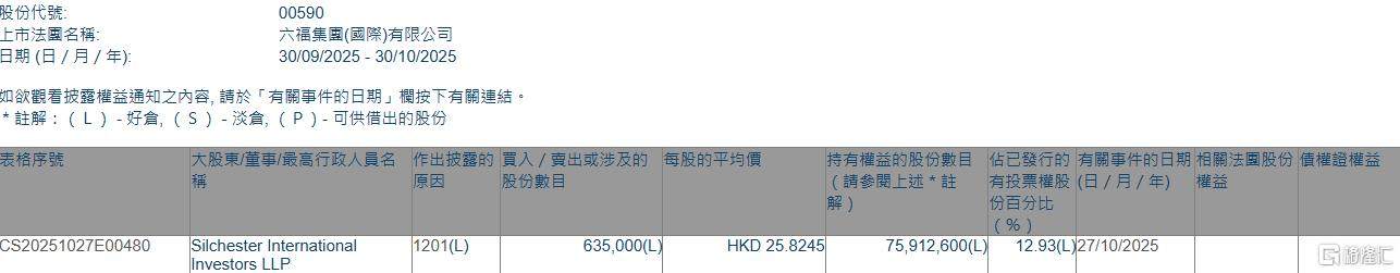 格隆汇10月30日丨根据联交所最新权益披露资料显示,2025年10月27日,六福集团(00590.HK)遭Silchester International Investors LLP在场内以每股均价2XM官方网址5.8245港元减持63.5万股,涉资约1639.86万港元。