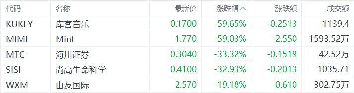 中概股收盘跌幅居前的个股为:库客音乐跌59.65%,Mint跌59.03%,海川证券跌33.32%,尚高生命科学跌32.93%,山友国际跌19.18%。(格隆汇)