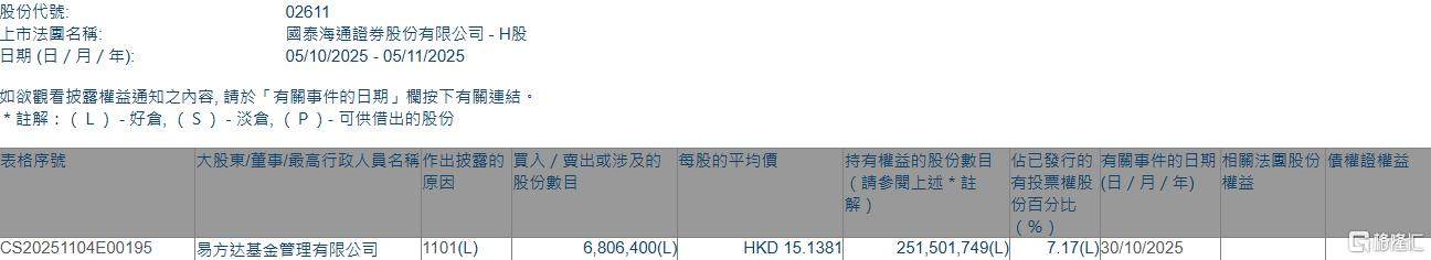 格隆汇11月5日丨根据联交所最新权益披露资料显示,2025年10月30日,国泰海通(02611.HK)获易方达基金管理有限公司在场内以每股均价15.1381港元增持680.64万股,涉资约1.03亿港XM官方网址元。
