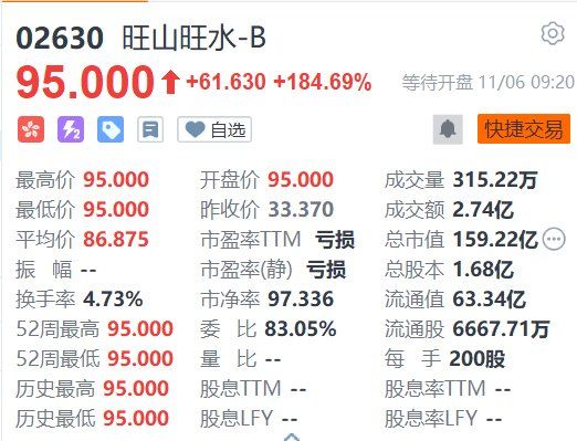 旺山旺水-B(2630.HK)今日首日在港挂牌上市,高开184.69%报95港元,市值159亿港元。该股IPO定价33.37港元,香港公开发售获6238.42倍认购,国际发售获16.87倍认购;所得款XM官方网址项净额5.2736亿港元。