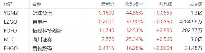 中概股收盘涨幅居前的个股为:明珠货运涨44.58%,易电行涨37.9%,恒峰科技创新涨32.51%,海川证券涨25.34%,君长数码涨16.28%。(格隆汇)