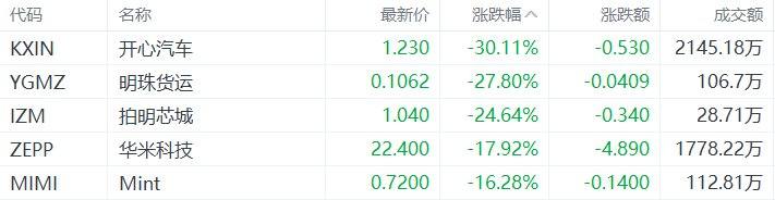 中概股收盘跌幅居前的个股为:开心汽车跌30.11%,明珠货运跌27.8%,拍明芯城跌24.64%,Mint跌16.28%。(格隆汇)
