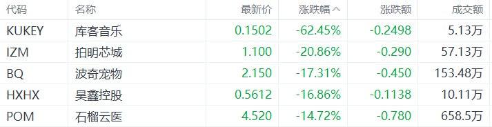 中概股收盘跌幅居前的个股为:库客音乐跌62.49%,拍明芯城跌20.86%,波奇宠物跌17.31%,昊鑫控股跌16.86%,石榴云医跌14.72%。(格隆汇)