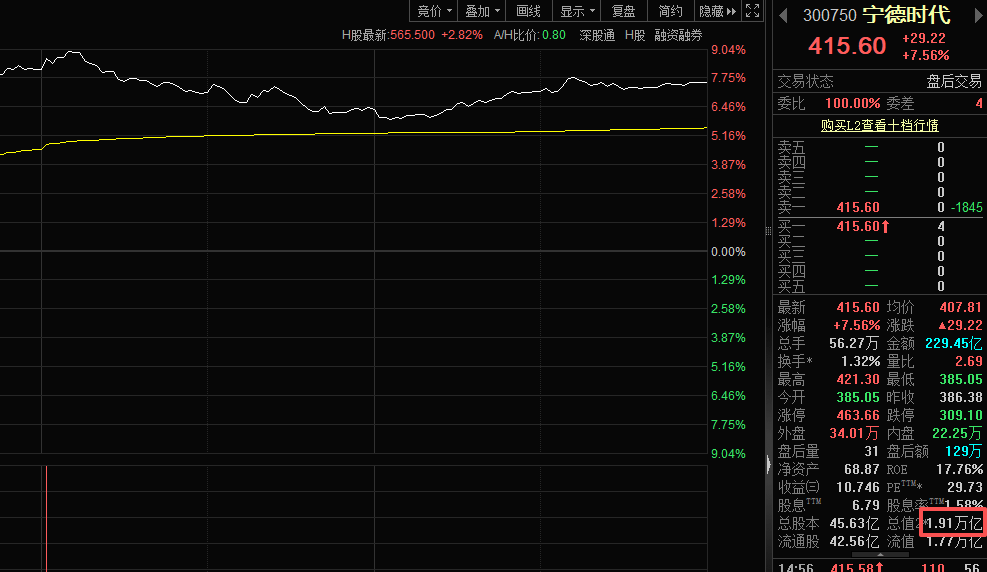 11月13日,宁德时代(300750)A股股价大涨超7%,收盘价达到415.6元,创出历史新高。从A股市值角度来看,宁德时代A股市值已突破1.8万亿元,位居A股第五,进一步拉近与贵州茅台(600519XM官方网址)的距离。