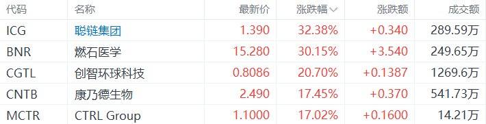 中概股收盘涨幅居前的个股为:聪链集团涨32.38%,燃石医学涨30.15%,创智环球科技涨20.7%,康乃德生物涨17.45%,CTRL Group涨17.02%。(格隆汇)