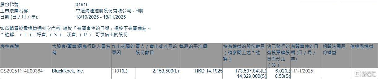 格隆汇11月18日丨根据联交所最新权益披露资料显示,2025年11月11日,中远海控(01919.HK)获BlackRock, Inc.在场内以每股均价14.1925港元增持好仓215.35万股,涉资XM官方网址约3056.35万港元。