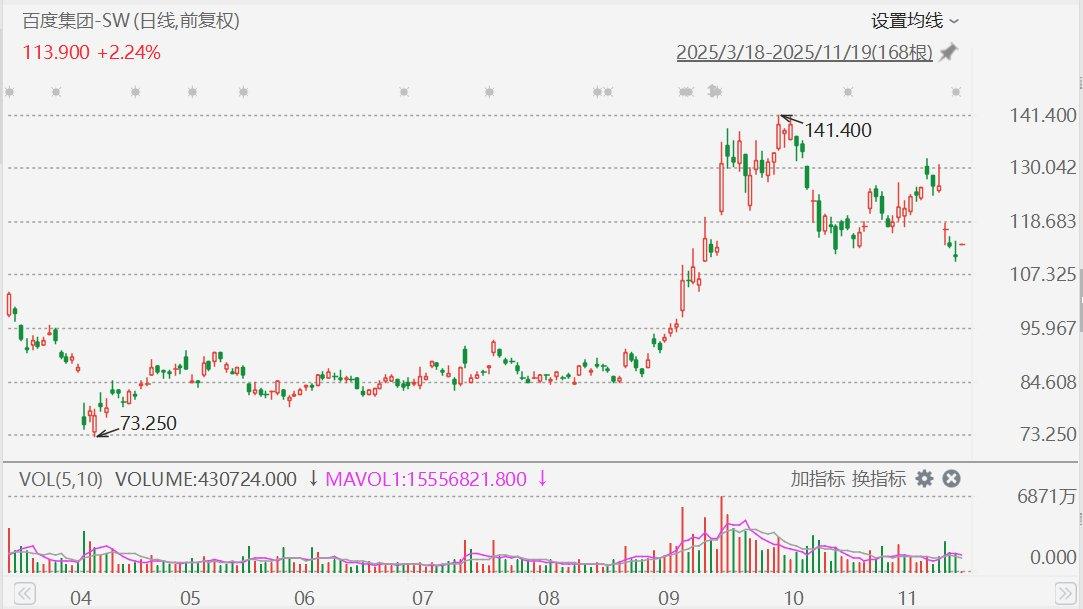 港股市场百度集团-SW(9888.HK)高开2.24%,报113.9港元;隔夜美股市场百度收涨2.66%报117.14美元,折算成港股市场价格为113.54港元/股。