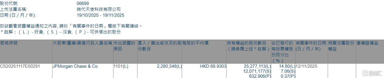 格隆汇11月19日丨根据联交所最新权益披露资料显示,2025年11月12日,时代天使(06699.HK)获JPMorgan Chase & Co.以每股均价68.9303港元增持好仓228.03万股,XM官方网址涉资约1.57亿港元。