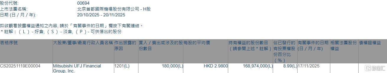 格隆汇11月20日丨根据联交所最新权益披露资料显示,2025年11月17日,北京首都机场股份(00694.HK)遭Mitsubishi UFJ Financial Group, Inc.在场内以每股均XM官方网址价2.98港元减持18万股,涉资约53.64万港元。