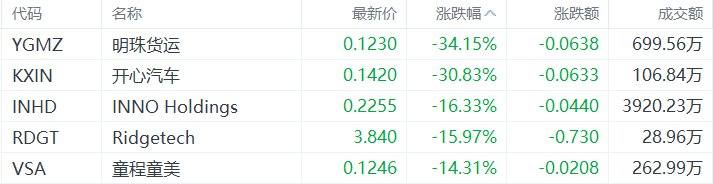 中概股收盘跌幅居前的个股为:明珠货运跌34.15%,开心汽车跌30.83%,INNO Holdings跌16.33%,Ridgetech跌15.97%,童程童美跌14.31%。(格隆汇)