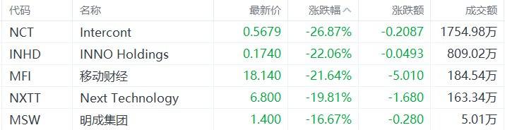 中概股收盘跌幅居前的个股为:Intercont跌26.87%,INNO Holdings跌22.06%,移动财经跌21.64%,Next Technology跌19.81%,明成集团跌16.67%。(XM官方网址格隆汇)