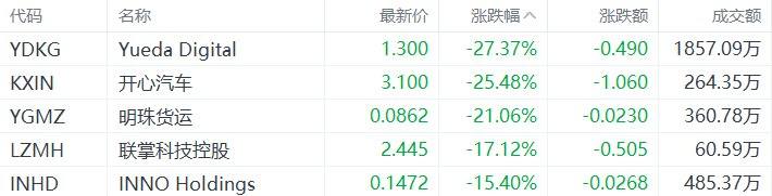 中概股收盘跌幅居前的个股为:Yueda Digital跌27.37%,开心汽车跌25.48%,明珠货运跌21.06%,联掌科技控股跌17.12%,INNO Holdings跌15.4%。(格隆汇)