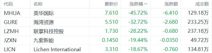 中概股收盘跌幅居前的个股为:美华国际跌45.72%,海湾资源跌32.72%,联掌科技控股跌28.22%,九紫新能跌19.44%,Lichen International跌18.67%。(格隆汇)