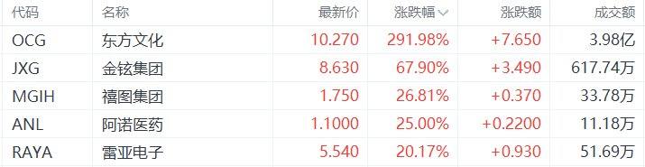 中概股收盘涨幅居前的个股为:东方文化涨291.98%,金铉集团涨67.9%,禧图集团涨26.81%,阿诺医药涨25%,雷亚电子涨20.17%。(格隆汇)