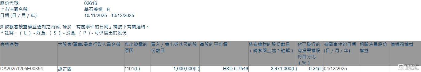 格隆汇12月10日丨根据联交所最新权益披露资料显示,2025年12月4日,基石药业-B(02616.HK)获非执行董事胡正国在场内以每股均价5.7546港元增持100万股,涉资约575.46万港元。