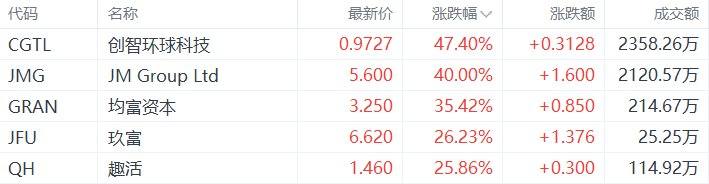 中概股收盘涨幅居前的个股为:创智环球科技涨47.4%,JM Group Ltd涨40%,均富资本涨35.42%,玖富涨26.23%,趣活涨25.86%。(格隆汇)