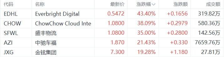 中概股收盘涨幅居前的个股为:Everbright Digital涨43.4%,ChowChow Cloud inte涨38.09%,盛丰物流涨35%,中驰车福涨21.43%,金铉集团涨19.28%。(XM官方网址格隆汇)