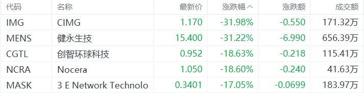中概股收盘跌幅居前的个股为:CIMG跌31.98%,健永生技跌31.22%,创智环球科技跌18.63%,Nocera跌18.6%,3 E Network Technolo跌17.05%。(格隆汇)
