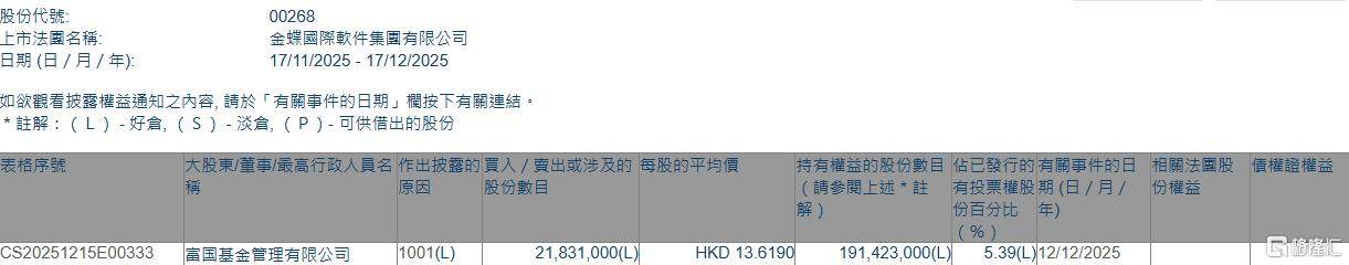 格隆汇12月17日丨根据联交所最新权益披露资料显示,2025年12月12日,金蝶国际(00268.HK)获富国基金管理有限公司在场内以每股均价13.619港元增持2183.1万股,涉资约2.97亿港元XM官方网址。