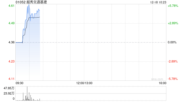 越秀交通基建(01052)早盘涨近6%,截至发稿,股价上涨5.05%,报4.58港元,成交额1086.92万港元。