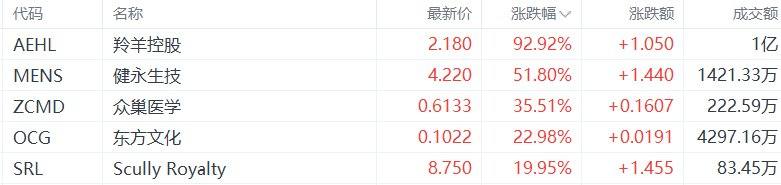中概股收盘涨幅居前的个股为:羚羊控股涨92.92%,健永生技涨51.8%,众巢医学涨35.51%,东方文化涨22.98%,Scully Royalty涨19.95%。(格隆汇)