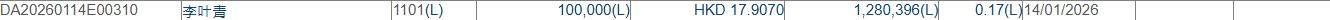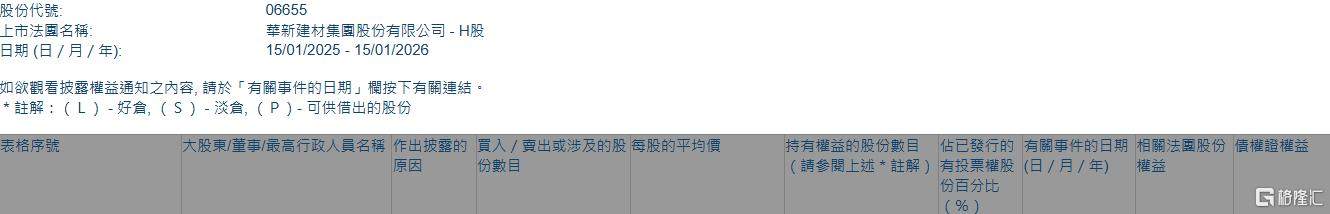 格隆汇1月15日丨根据联交所最新权益披露资料显示,2026年1月14日,华新建材(06655.HK)获执行董事李叶青(总裁)在场内以每股均价17.907港元增持10万股,涉资约179.07万港元。