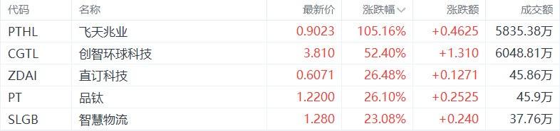 中概股收盘涨幅居前的个股为:飞天兆业涨105.16%,创智环球科技涨52.4%,直订科技涨26.48%,品钛涨26.1%,智慧物流涨23.08%。(格隆汇)