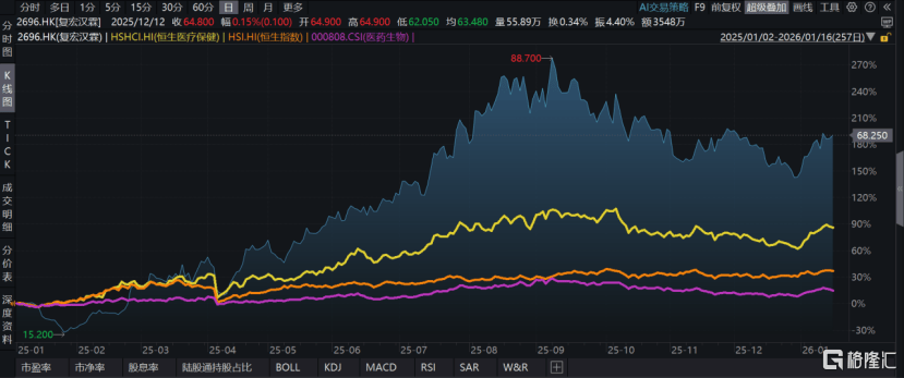市场数据清晰印证了这一趋势。根据WIND数据显示,截至2025年12月31日,港股与A股医XM官方网址药板块年内均录得可观涨幅。其中,恒生医疗保健指数表现尤为亮眼,累计涨幅达56.95%。而作为中国创新药出海的代表性企业,复宏汉霖(2696.HK)的市场表现更为突出,年内涨幅高达140.71%,期间最XM官方网址高涨幅更是一度突破505%,成为贯穿全年的焦点之一。2026年开年以来复宏汉霖已经累计涨幅19.63%,表现亮眼。