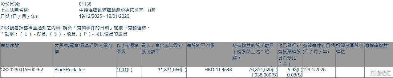 格隆汇1月19日丨根据联交所最新权益披露资料显示,2026年1月12日,中远海能(01138.HK)获BlackRock, Inc.在场内以每股均价11.4548港元增持好仓3183.2万股,涉资约3XM官方网址.65亿港元。